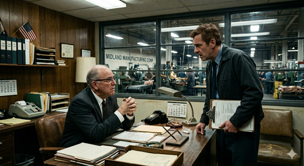 Scene: Owner’s office. Afternoon sunlight filters in. The mood is quiet, a little tense, but not confrontational.